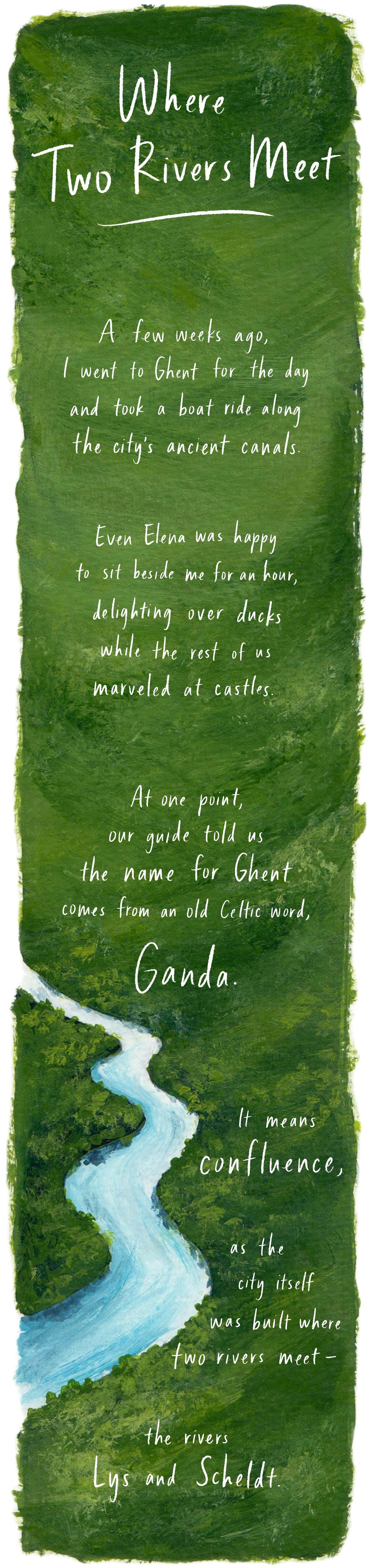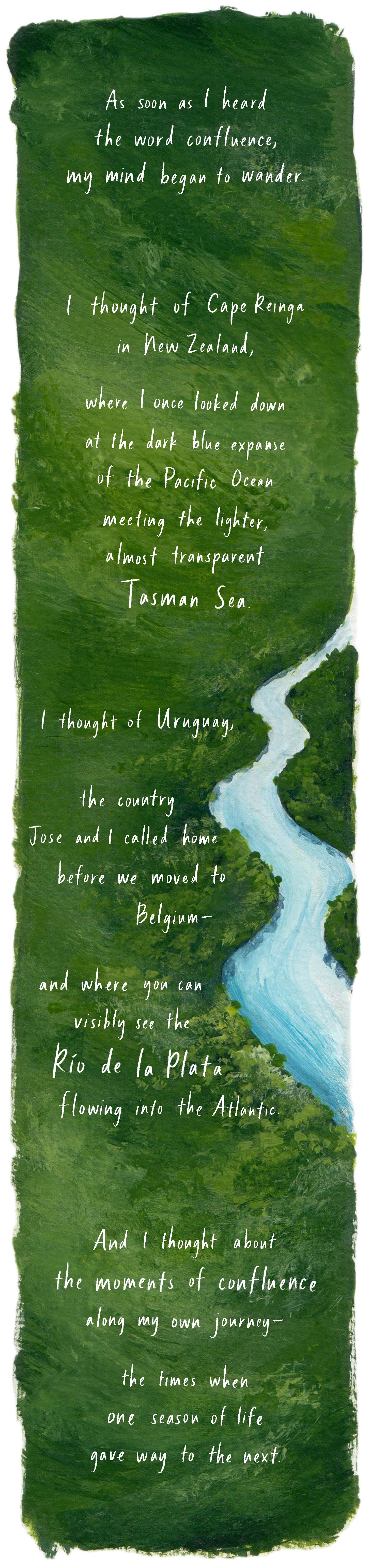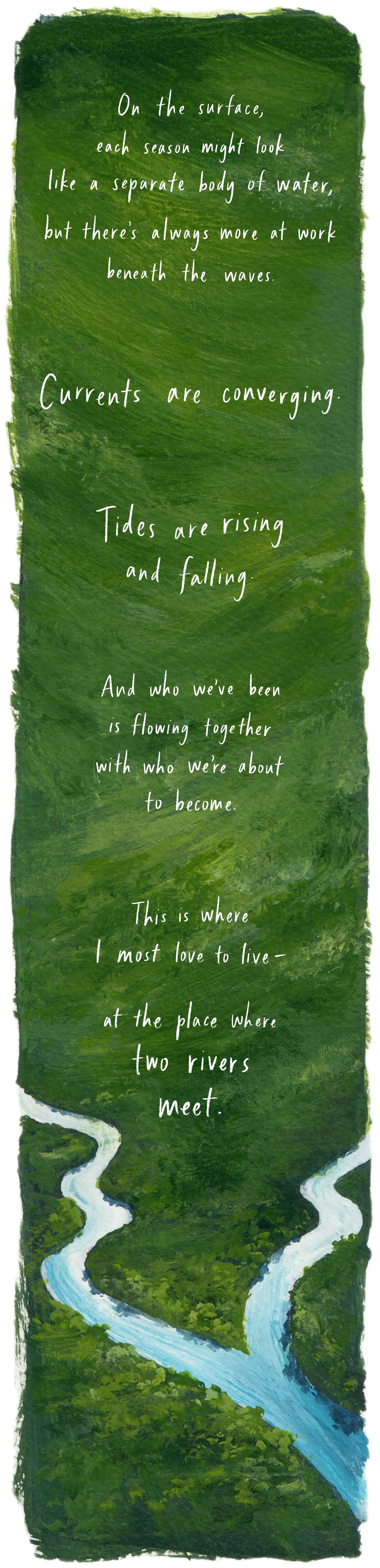 "This is where I most love to live--the place where two rivers meet." I love that line and I love the one Kathryn picked out too "And who we've been is flowing together with who we're about to become." Both are wonderful insights for right now. And the confluence I think about is the Green and Colorado rivers here in the American West, where the Green, muddy and olive-green most of the year, flows into the Colorado as a wide stripe. It takes several miles for the two rivers' water to mix and that stripe to disappear into the river that they make together. Thank you and many blessings!